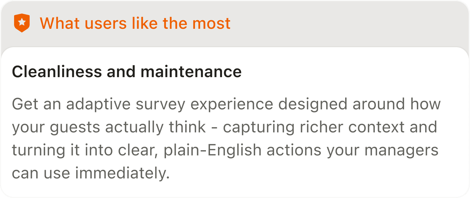 An adaptive survey built around how guests actually think. Capture richer context and turn it into clear, plain-English actions your team can use straight away.